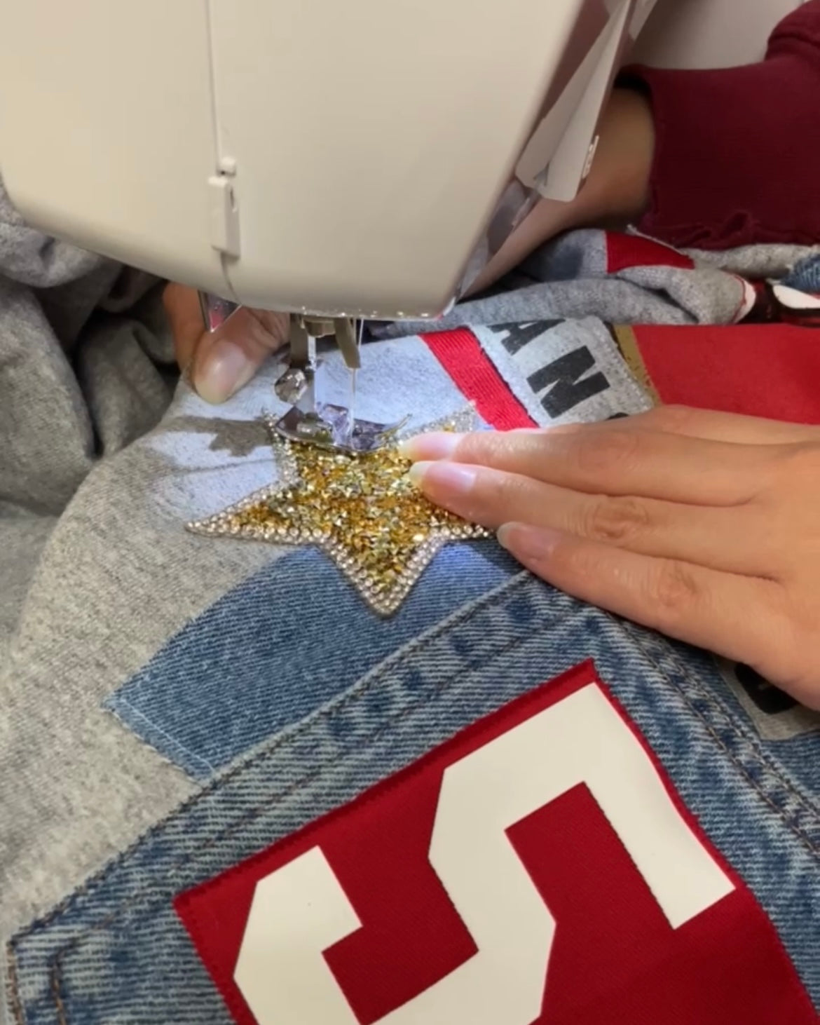Support your loved one with a Custom Star Patch Embroidered Sweatshirt. White sweatshirt with two large stars sewn on each sleeve, last name embroidered on the front. Choose your star fabric (denim, jersey, cotton blend) and embroidery thread color.
